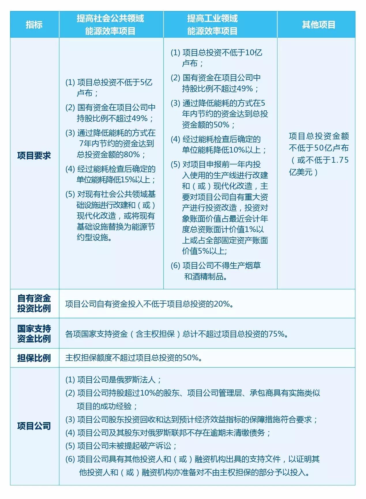 1016号令中规定了三类普通投资项目,提高社会公共领域能源效率项目、提高工业领域能源效率项目、其他项目。如果投资人或融资机构希望就这三类普通投资项目申请俄罗斯主权担保,项目需满足下表规定的相应指标:
