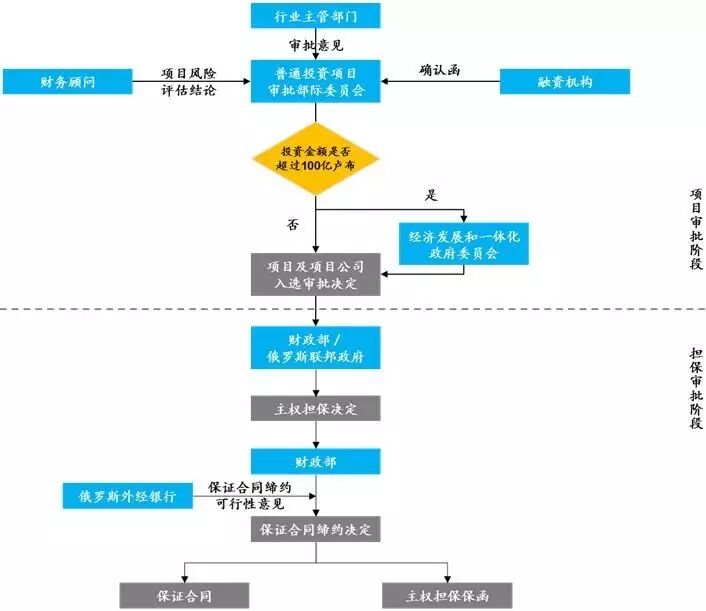 2016年政府财政预算中既定的主权担保类型中,大多数主权担保类型或针对特定地区、特定行业发展,或支持国防工业等国民经济命脉企业,或支持俄罗斯货物、工程和服务出口。对大多数中国投资者而言,普通投资项目主权担保和优惠贷款投资项目主权担保,可能是少数能够普遍适用的主权担保类型,其中优惠贷款投资项目对项目融资结构、贷款人还存在特殊限定。因此,下面以普通投资项目为例,简要介绍俄罗斯主权担保的审批程序。