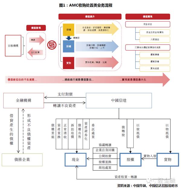 收购重组类业务则指AMC在不良资产的收购环节,即在确认债务债权关系的基础上,根据不良资产风险程度确定 实施债务或资产重组手段,并与债务人及相关方达成重组协议的业务。主要针对流动性暂时出现危机的企业,提供个性化定制的重组手段,进行信用风险重新定价并 将风险信用化解前移,发掘资产价值,在风险可控的情况下追求更高的重组溢价。
