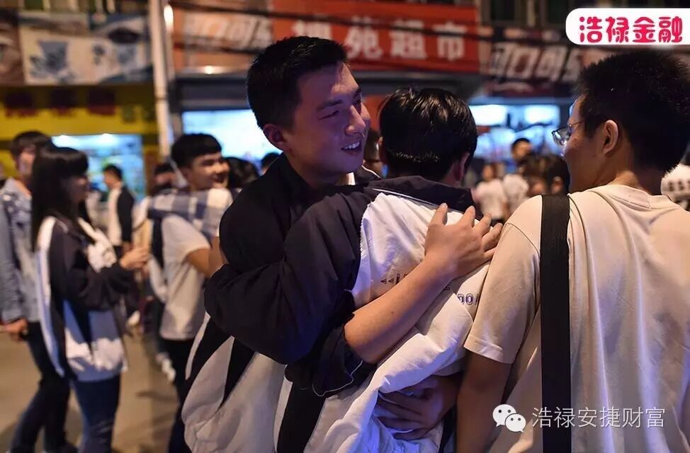 2015年】64日晚9点,安徽毛坦厂中学,考生上完最后一堂课后走出校园,拥抱庆祝。