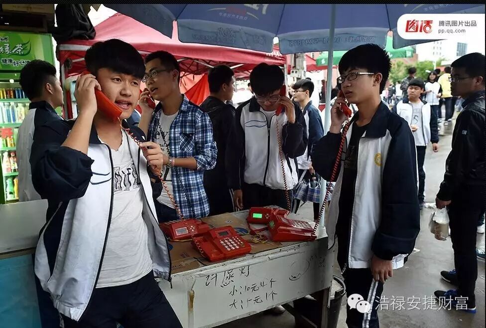 2016年】527日,安徽毛坦厂中学,下午放学后,几个学生跑到店铺打公用电话,向大人要钱。为了让考生安心学习,学校规定不准学生携带手机进学校,一些家长索性不给学生买手机,因此公用电话依然随处可见。