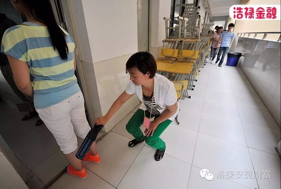 【2014年】68日,合肥六中考点,一名监考教师给学生扫描安检。随着高考作弊手段的不断电子化,高考的安检措施也越来越严格。