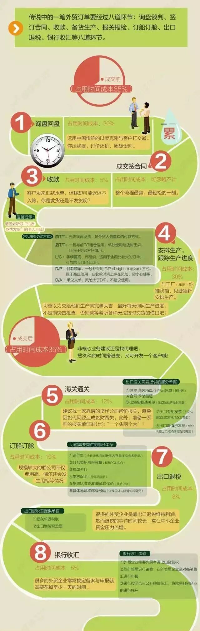 传说中的一笔外贸订单要经过八道环节:询盘谈判、签定合同、收款、备货生产、报关报检、订船订舱、出口退税、银行收汇。