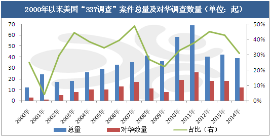 据相关数据显示,中国成为美国“337调查”的最大受害国,败诉率高达60%,远远高于世界平均值26%。截至2014年,我国连续13年因为知识产权侵权成为遭受美国“337调查”最多、涉案金额最高的国家。以下为2000年以来,美国“337调查”案件的总量以及对华调查数量,不难看出,对华调查案件数量所占总量比例较高,最高为2007年的48.57%,比例逼近一半。