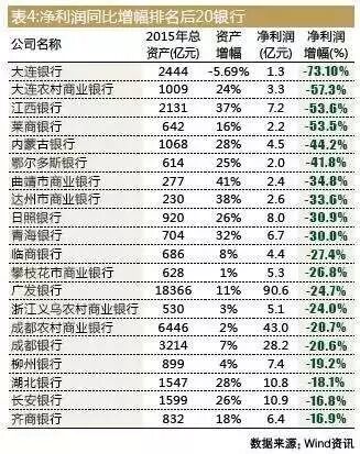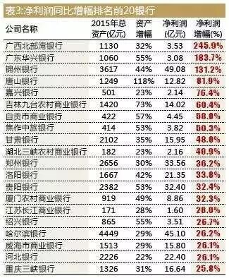 当然,《投资者报》记者注意到,在一片寒冬中,部分银行的利润增速仍然是创造了奇迹,震惊同业。Wind数据显示,2015年,盈利增速排名前五的广西北部湾银行、广东华兴银行、锦州银行、唐山银行以及嘉兴银行,盈利增速超过七成。