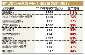 唐山银行也是业绩持续增长的典型。2014年,该行实现税后净利润达到7亿元,同比增长1.94倍,总资产572.6亿元。到了2015年,净利润达到12.8亿元,同比增幅87%,总资产已经达到1249亿元。