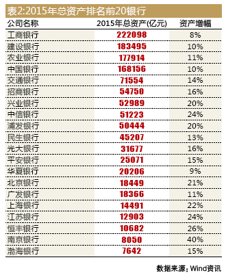银监会的数据显示,2015年商业银行总资产150.94万亿元,比上年增长15.4%。已经公布年报的110家银行中,仅有大连银行总资产出现了下降,其他银行均实现了增长。