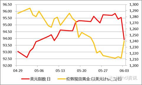 06-03,最新公布的5月非农3.8万新增就业人数,跌至近6年来最低水平,引发市场剧烈震荡。美元指数跌破94关口收报93.90。黄金和白银出现巨幅震荡。COMEX黄金期货上涨2.5%,报1242.90美元/盎司,创3月中旬来最大单日涨幅。
