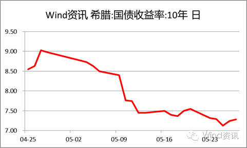 05-10~25,欧元区财长提出可从2018年起为希腊提供债务宽免措施,希腊10年期公债收益率下跌60BP突破8%关口至7.83%。25日,收益率继续下挫至7.07%,创6个月低位,为去年8月来最大单月跌幅。
