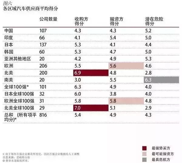 日本供应商相对稳定。日本供应商的“撤资方”得分仅4.1,全球100强中的日本供应商得分3.8,在各区域中得分最低。同时日本供应商“潜在危险”得分也很低,因此不容易被收购;2015年被收购的日本供应商仅占4%。南美供应商最为动荡,潜在危险得分6.3,高于其他所有区域得分。