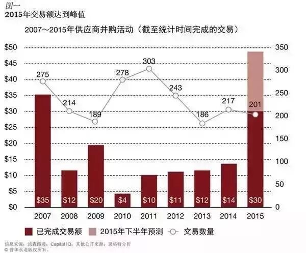 供应商并购活动很活跃,值得注意的是并购量从2014年的217起下降到了2015年的200起左右。平均交易价值依然维持在5000万~1亿美元。2015年并购活动的最大特点是超过5亿美元的交易更多,此类特大交易的数量是2014年的两倍。