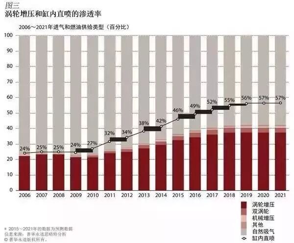 其他的大型供应商通过并购实现为所有类型的发动机提供燃油经济性更好的动力总成系统,以更好的满足法规的需求。2021年起美国和欧洲规定每加仑汽油必须支持行驶50英里以上。例证之一就是近期博格华纳收购雷米国际,大大加强了博格华纳在传统汽车和混合动力汽车涡轮增压发动机领域的先进电子产品能力。提升发动机燃料油经济性能为供应商带来诸多益处。根据Autofacts预测,到2021年,缸内直喷和涡轮增压/机械增压的全球渗透率将达到57%、40%(见图三)。