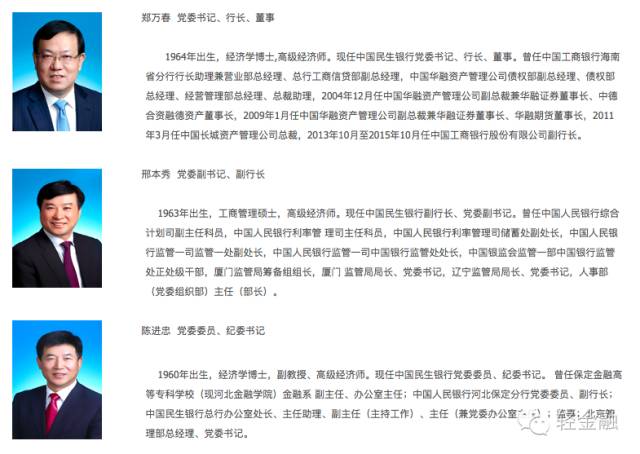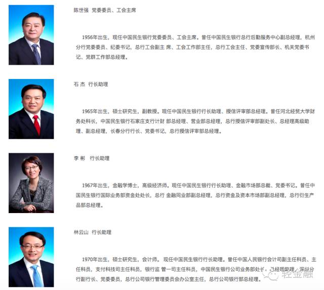 根据民生银行官网,目前,民生银行行长为郑万春,该行管理层另有3位行长助理,分别是石杰、李彬和林云山。管理层信息如下: