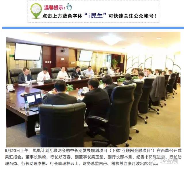发现,邢本秀最新一次公开露面,是2016年5月20日上午,在西单出席凤凰计划互联网金融中长期发展规划项目(下称“互联网金融项目”)成果汇报会。距离其被民生银行解聘仅仅半个月的时间,似乎是突然遭解聘。