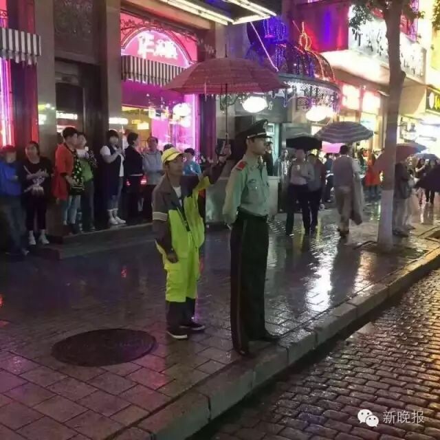 10号晚上7点多钟,哈尔滨突然下起了一场雨。中央大街上没有带雨伞的行人都纷纷躲到了屋沿下避雨。在街上执勤的战士不能去避雨,他们纹丝不动地站在雨中坚守岗位。一个环卫大爷站悄悄地站在了站士的身后,高举着雨伞默默地替战士挡雨。