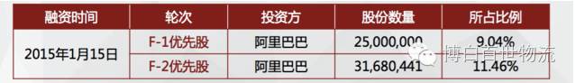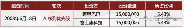 阿里巴巴除了在2008年投资百世物流以及在C轮、E轮融资中有小幅追加外,值得注意的是,在2015年1月,阿里巴巴重金进入,投资约5.5亿美元(根据投前估值计算,可能不准确),获得了20.5%的股权。大手笔吧。