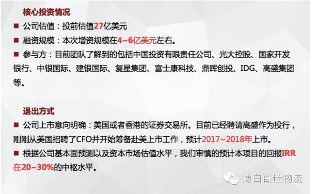2,百世物流投前估值时27亿美元,预计此次增资规模在4-6亿美元,增资之后的股东预计共持有15.6%的股份(暂定)。也就是说,投后估值最高预计为38亿美元。