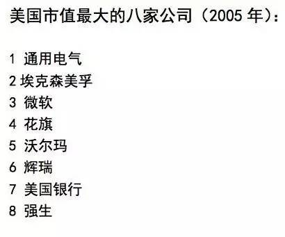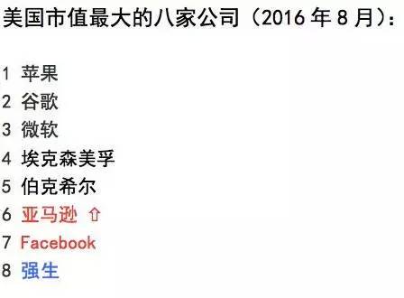 金融股经历了金融危机,似乎伤重难愈,翻不了身。花旗与美国银行退出排行榜。医药消费的杰出代表:强生与辉瑞,排名仍然在前二十名,我们人类永久依赖医药。通用电气是工业股的代表,经历了杰克韦尔奇的黄金时代。通用电气已经剥离了金融,方方面面出现了放缓,公司将再次聚焦主业并转型发展。沃尔玛的衰落,则是因为一个公司崛起:亚马逊。