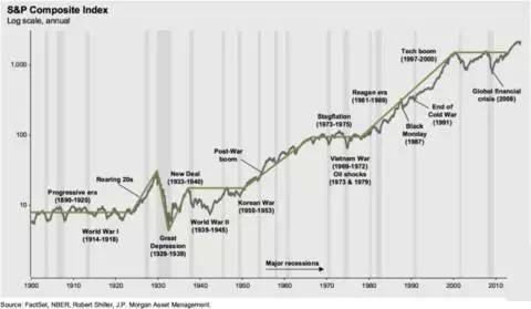 伯克希尔,取代了通用电气成为传统行业强盛的代表。然而,相信任何人也难以复制巴菲特的模式,他利用了保险浮存金、利用了美国保险业的宽松监管、最重要的是他只投资美国,只投资美国最伟大的公司,并且buy&hold,因此巴菲特成为了股神。在巴菲特投资美国50年的这个期间,标准普尔指数的走势很好地回答了股神是怎么炼成的这样一个问题: