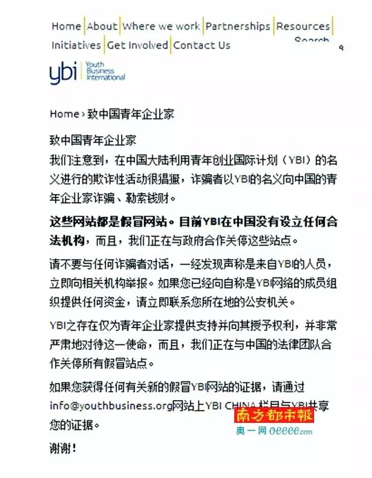 然而,南都记者在英国YBI官网首页发现,该页面有一条中英文置顶提示,表示“YBI中国网址是一个欺诈网站”。