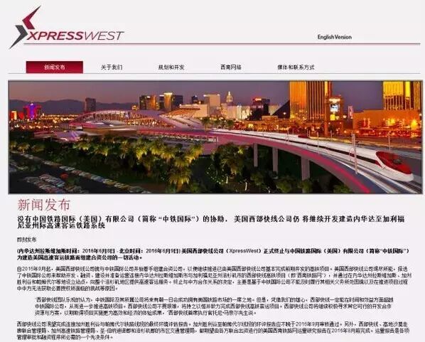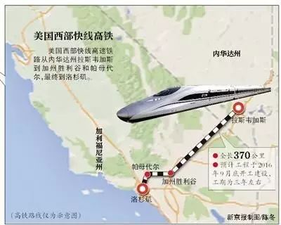 去年9月,中铁国际美国公司和西部快线联合公布,将组建合资公司,加速启动连接拉斯维加斯和洛杉矶的高铁项目。这个项目全长370公里,初期投资1亿美元,总投资额达127亿美元,原计划2016年9月开工。有报道称这是中国在美国建设的第一个高速铁路项目。