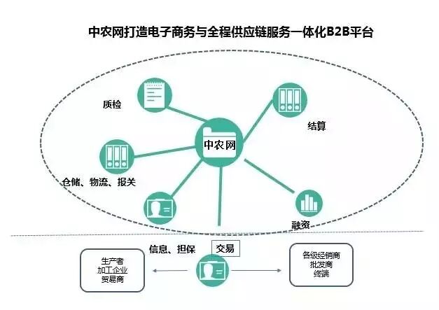 经过2013年的战略及业务转型,中农网创新建立了“平台+自营+供应链”的商业模式,深入向全产业链上下游延伸,以农产品B2B业务为主营业务,通过整合产业链上下游的各项资源,充分利用供应链链条上各个环节的优势,为客户提供集成信息、担保、结算、融资、质检、仓储、物流、报关等线上及线下配套服务,为解决行业痛点创造重要价值。
