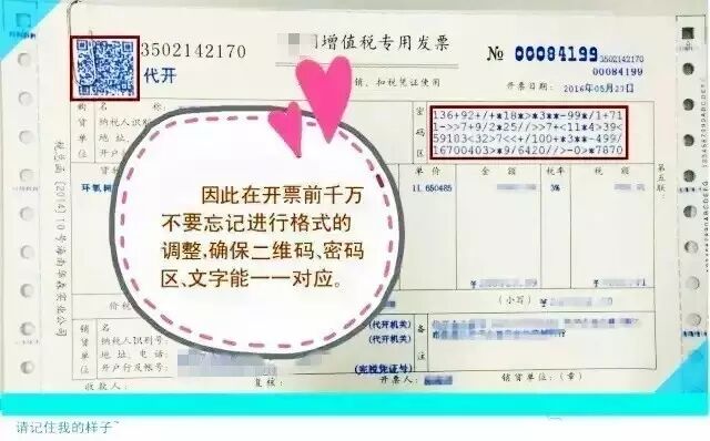 全面营改增推开已经一个多月了,原来的营业税纳税人可能对新开票系统不太熟悉,开票过程中容易出现一些开错的情况。税务部门提醒广大营改增试点纳税人,及时掌握增值税相关政策,特别是了解常见税目税率,以免出现开错票甚至不能申报的情况。导致二维码或者密码区与文字重叠、不清楚的情况,使所开发票无法进行正常的发票认证。提醒:《发票管理办法》规定,打印发票字迹要清楚,不得压线错格,要确保打印格式精准,不得将二维码或密码区与表样原有内容重叠,否则将影响发票的使用,产生无效票。那么,正确的格式是什么样子呢?请往下看~~