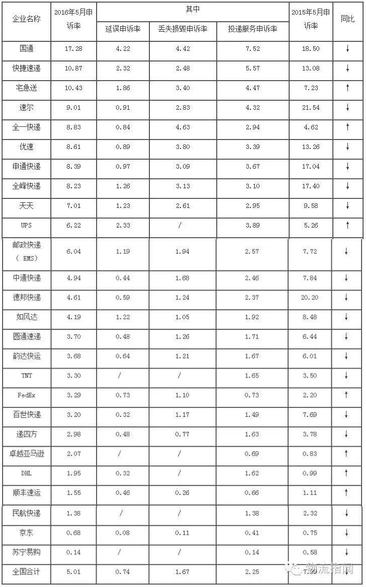 申诉比较集中的问题是投递服务和丢失短少,占比分别为45.0%和21.5%。此外,5月份消费者对40家快递企业进行了有效申诉,其中国通、快捷速递、宅急送排名较为靠前。