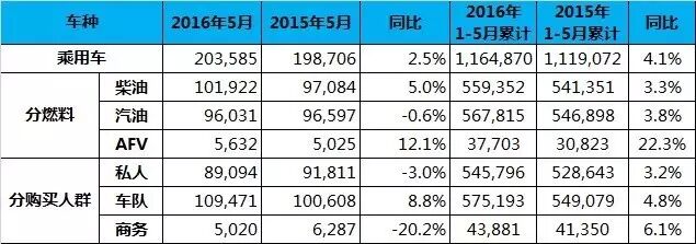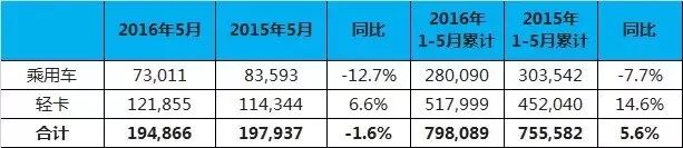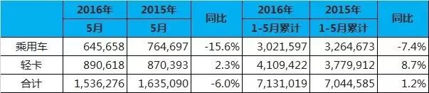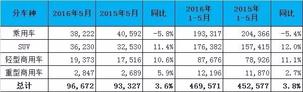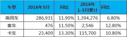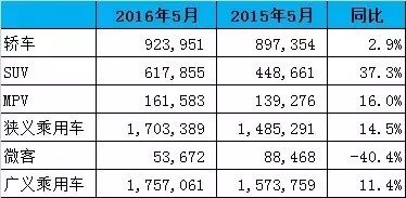 中国5月新车销量176万辆 同比增长11.4% 6月8日,全国乘用车市场信息联席会发布2016年5月乘用车销量情况:5月,全国广义乘用车累计销量1,757,061辆,环比上升2.4%,同比增长11.4%。其中,轿车销量923,951辆,同比增长2.9%;SUV销量617,855辆,同比增长37.3%;MPV销量161,583辆,同比增长16%。