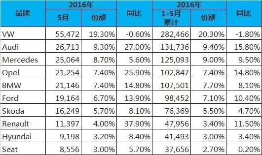 德国5月份乘用车销量28.7万辆同比增11.9% 德国交通部(KBA)近日公布了5月新车注册量,5月份德国乘用车销量28.7万辆,同比增长11.9%;商用车中的客车注册量476辆,同比增长11.5%,卡车注册量23,409辆,同比增长13.3%。