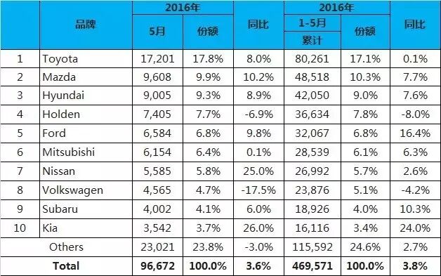 澳大利亚5月新车销量9.7万辆 增长3.6% 澳大利亚汽车工业协会(FCAI)近日发布5月新车销量情况,5月澳大利亚新车销量同比增长3.6%至96,672辆。其中乘用车销量同比下降5.8%至38,222辆,SUV增长11.4%达36,230辆,轻型商用车增长10.6%达19,373辆,重型商用车增长5.9%达2,847辆。 以下是5月销量前十品牌: