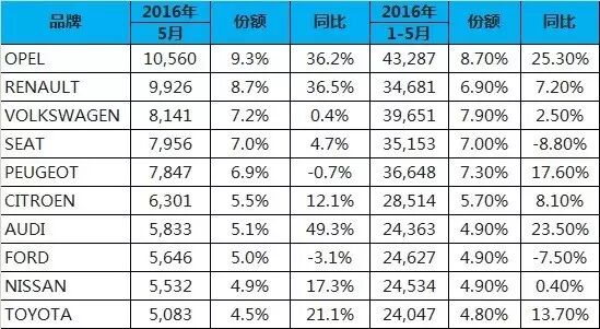 西班牙5月乘用车销量11.4万辆 增长20.9% 西班牙汽车工业协会(ANFAC)近日公布,西班牙5月乘用车注册量113,671辆,同比增长20.9%。1-5月累计同比增长12.5%达499,444辆。 以下是西班牙5月前十销量品牌: