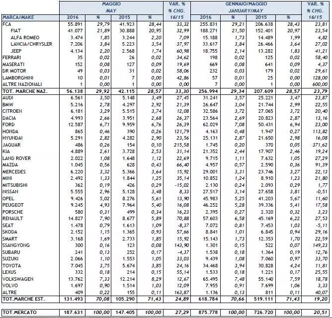 意大利5月乘用车销量18.8万辆 增27.29% 意大利汽车工业协会(ANFIA)近日公布,意大利5月乘用车注册量187,631辆,同比增长27.29%。 从分品牌来看,5月份意大利国内整车厂的乘用车合计注册量56,138辆,同比增长33.30%,占市场份额的29.92%;国外整车厂合计注册量131,493辆,同比增长24.89 %。 以下是分品牌乘用车销量情况: