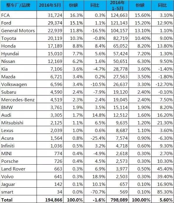 美国5月新车销量154万辆 同比下降6.0% AutoData 近日发布,5月美国新车销量1,536,276辆,同比下降6.0%。其中乘用车销量同比下滑15.6%至645,658辆。轻卡销量890,618辆,同比增长2.3%。 日系企业中,丰田5月销量下降9.6%至219,339辆,占市场份额14.3%;本田汽车销量下降4.8%至147,108辆;日产汽车销量同比下降1.0%至133,496辆;斯巴鲁增长1.1%至50,083辆;马自达增长1.6%至18,728辆;三菱下降5.7%至9,025辆。 韩系车企中,现代销量71,006辆,下降11.6%;起亚销量62,926辆,增长0.8%。 欧系车企中,奔驰销量32,147辆,下降0.6%;大众销量28,779辆,同比下滑17.2%;宝马销量29,017辆,同比下降6.4%;奥迪销量18,728辆,增长1.6%;沃尔沃销量5,536辆,增长10.2%;路虎销量4,950辆,下降8.0%。