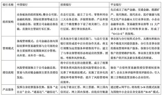 随着现代互联网不断发展,电子化、线上化、网络化已成为供应链金融业务的发展趋势,既能满足供应链金融“短、频、快”的服务需求,也能帮助银行更好得实现信息及风险的实时监控。以下介绍具有代表性的中国银行、招商银行及平安银行(原深圳发展银行)的在线供应链金融业务模式比较(见下表)。