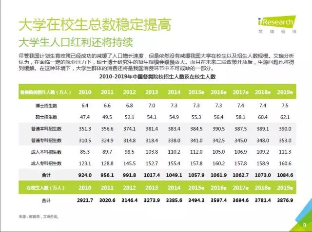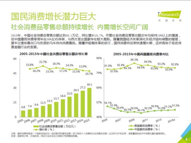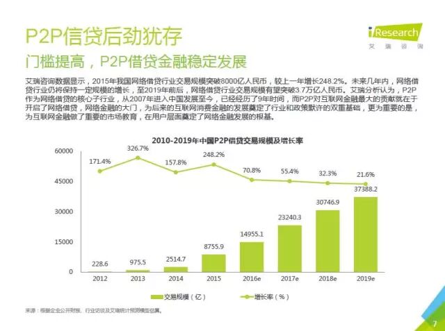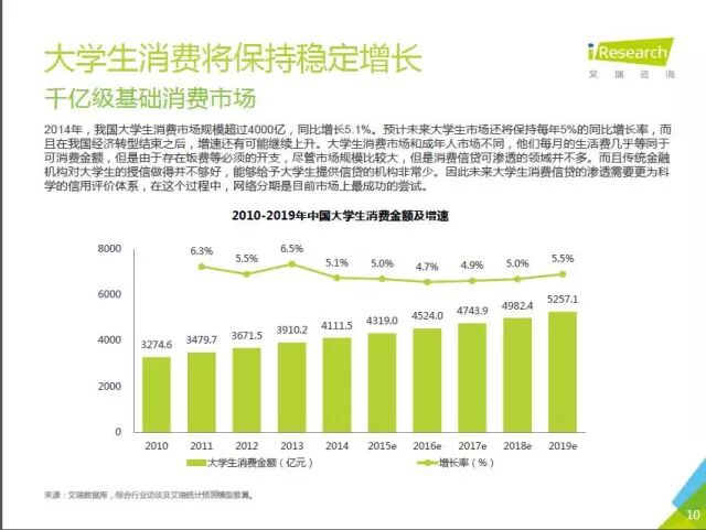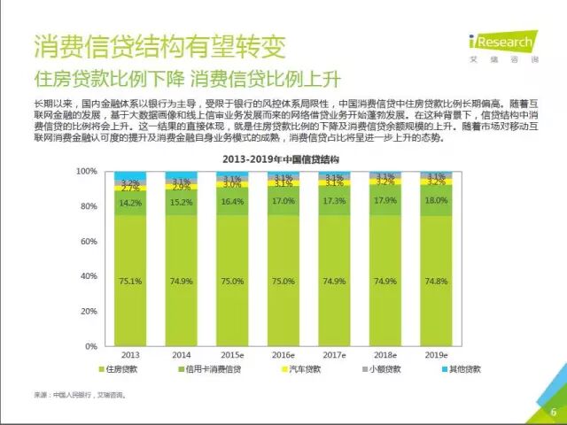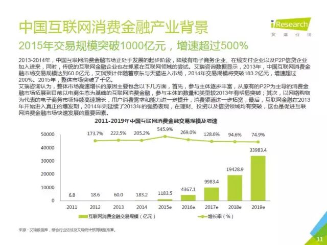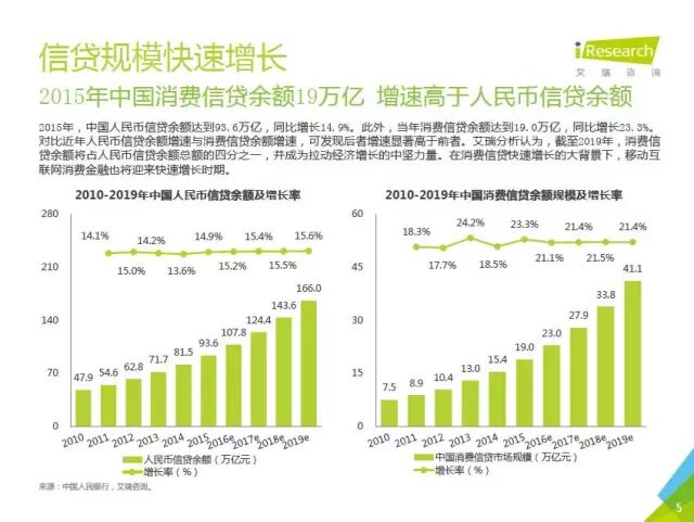 数据显示,2015年中国人民币信贷余额达到93.6万亿,同比增长14.9%;同期消费信贷余额达到19.0万亿,同比增长23.3%。前述报告认为,近年消费信贷余额增速显著高于人民币信贷余额增速。预计2019年消费信贷余额将占人民币信贷余额总额的四分之一,并成为拉动经济增长的中坚力量,在消费信贷快速增长的大背景下,互联网消费金融市场也将迎来快速增长。