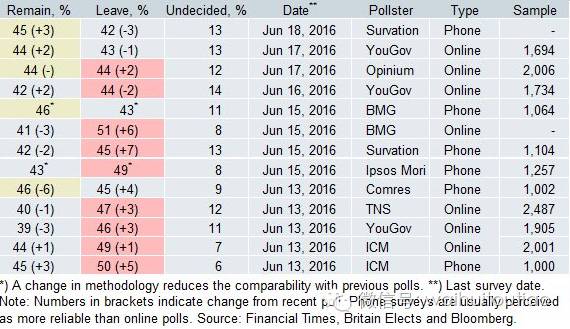 一声枪响,英国退欧民调意外扭转,支持留欧的比例上升(看下图时注意调查机构和调查时间)。
