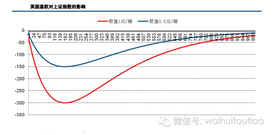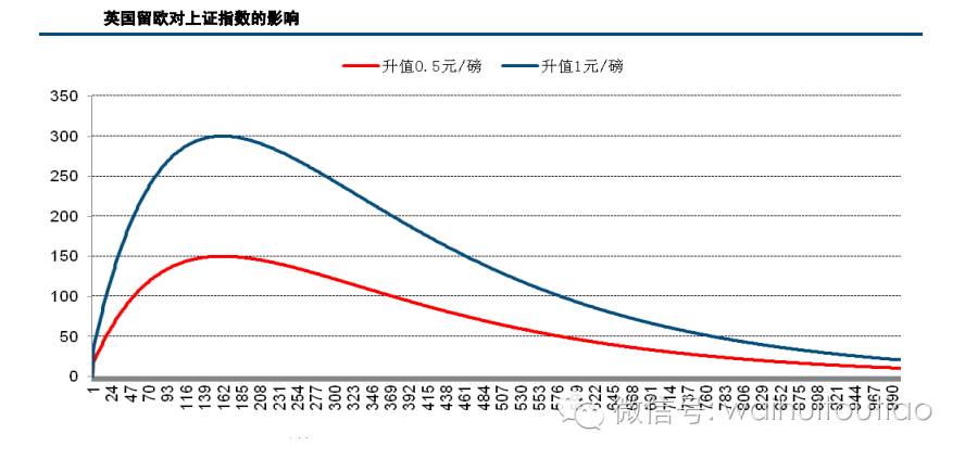 中信建投采用HMTreasury Analysis(2016)提供的VAR(2)的方法,估算英国留欧和英国退欧两种情形下A股的表现。结果发现:这两种情形是对称脉冲式的影响。英国留欧,如果英镑回升0.5元/磅,对上证指数的提升大概在5%左右的幅度;如果英镑上升1元/磅,对A股的提升作用大概有10%左右的幅度。英国退欧,如果英镑贬值1元/磅,对A股的打压作用大概有10%左右的幅度。