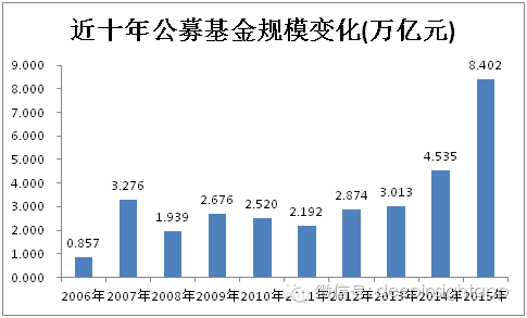 我们先说说公募基金。下图是2006到2015年公募基金规模的变化。可以看到整个公募基金的规模一定是在牛市最高点达到顶峰的。这也和商业模式有关。公募基金主要还是靠管理费赚钱,规模越大收入越高。而且在牛市最癫狂的时候一定是基金最好发的,大量基金公司通过发行新产品完成了规模的跳跃。事实上,2007年牛市见顶后,如果仅仅看股票类资产规模的话,到了2014年还没有真正回到07年的水平。在七年的“熊市”中,基金公司的资产规模主要通过货币,债券等产品做大。
