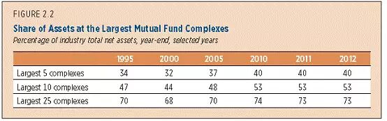 最后的结果是什么?行业集中度提高。因为大基金公司品牌大,渠道广,产品线也丰富,所以1995年到2012年,整个市场规模最大的5家资产管理公司市场份额从34%提高了40%。整个前25的资产管理公司,管理的市场份额达到73%。