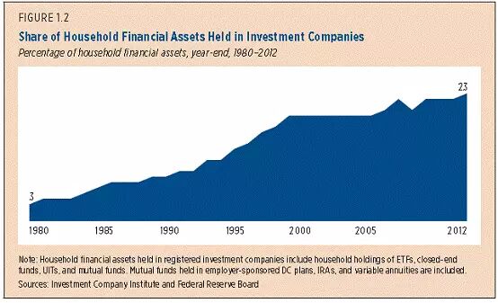 如果我们看美国的话,有一大批几十年的基金管理公司,从Vanguard,Templeton, 到Fidelity,Capital等。毫无疑问美国拥有一大批全球资产规模最大的基金公司。根据2013年底的数据,美国资产管理公司规模14.7万亿美元,其中13万亿来自于共同基金。其中有一个重要的时代背景:过去30年美国经济的高速发展,大幅甩开了日本,欧洲这些追赶者。这也导致美国企业受益于这30年的大发展,最终早就了一波大牛市。道琼斯指数在1980年还只有1000点,到了2000年突破了10000点,20年上涨10倍。这也导致家庭资产在共同基金的配置也大幅提高。从1980年的3%提高到了今天的25%。