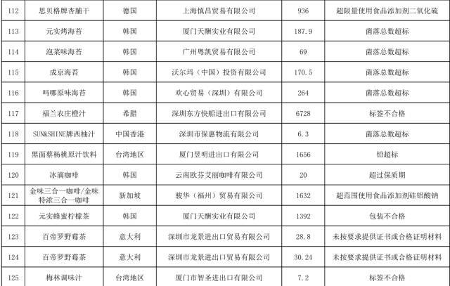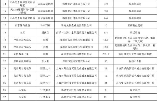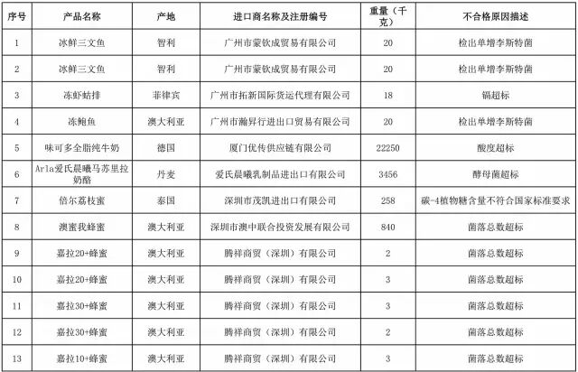 由沃尔玛(中国)投资有限公司进口的1批产地为“韩国”的成京海苔因菌落总数超标被退货。由深圳市澳中联合投资发展有限公司进口的1批产地为“澳大利亚”的澳蜜我蜂蜜因菌落总数超标被退货。
