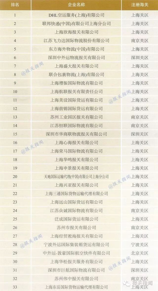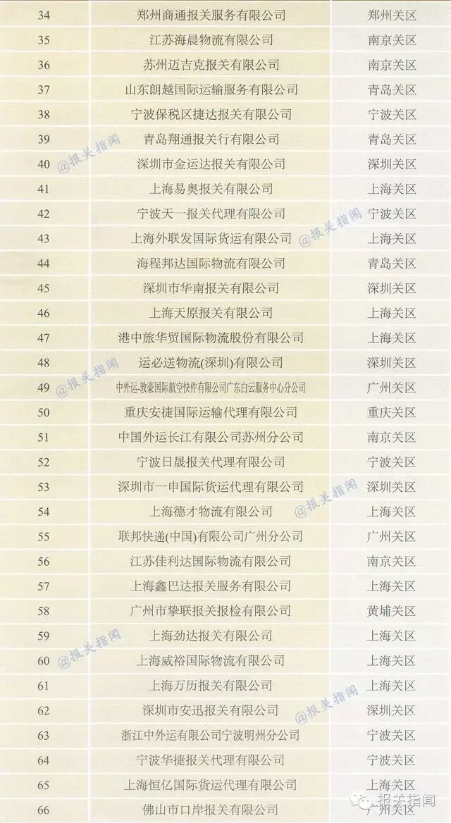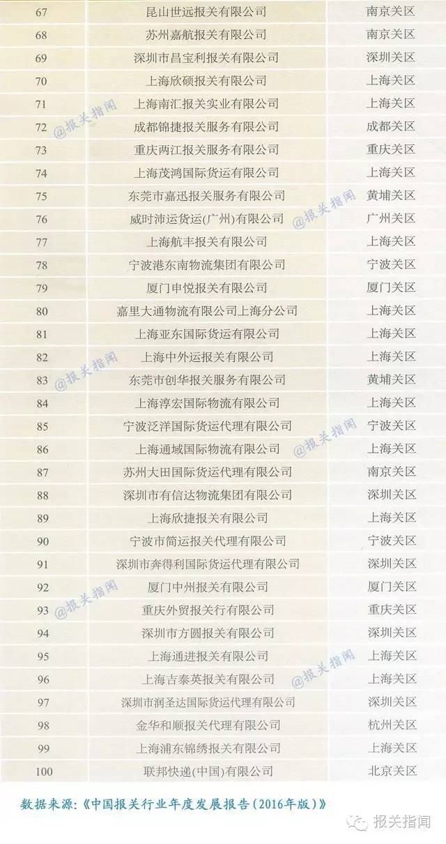 在前100强中,上海关区45家,南京关区13家,深圳关区13家,宁波关区9家,广州关区4家,青岛关区、黄埔关区、重庆关区各3家,北京关区、厦门关区各2家,杭州关区、郑州关区、成都关区各1家。具体企业名单见下图: