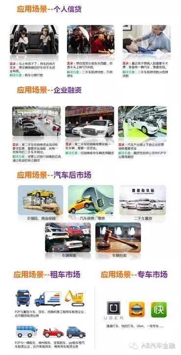 令人可喜的是,随着互联网的日益普及,互联网已经深入人们生活的各个方面,汽车金融领域也不例外。特别是李克强总理提出“互联网+”行动计划后,互联网+汽车金融被激发出更大的活力。国外有Zopa与Uber达成战略合作协议,国内有诸如理财范、第一车贷、宜信等P2P企业大举发力互联网汽车金融。作为新兴领域,互联网汽车金融并不为大家所熟知。鉴于此,笔者将汽车金融所涉及的范畴,互联网金融与汽车金融相结合的业务模式、应用场景等,解析互联网汽车金融到底有个什么卵用~!?要了解什么是互联网汽车金融,首先要搞懂什么是汽车金融。根据百度百科的解释,汽车金融是由消费者在购买汽车需要贷款时,可以直接向申请优惠的支付方式,可以按照自身的个性化需求,来选择不同的车型和不同的支付方法。其实这只是服务于汽车销售环节的汽车金融。而广义的汽车金融是贯穿于汽车行业整体产业链的,为汽车生产环节、销售环节、售后市场提供融资及其他金融服务。我们根据汽车用户合作方的不同,可以将当前市场上汽车金融划分为以上五种模式:一、银行模式。例如,用户使用信用卡分期购车,在银行申请贷款购车。二、保险公司。主要为车主提供保险金融服务,如交通强制保险,商业保险等。三、汽车商。这种模式一般是汽车厂商经银监会批准设立的汽车金融公司为车主提供一系列金融服务。包括购车贷款、汽车租赁、二手车金融等业务。四、互联网公司。例如,互联网巨头腾讯、阿里推出的滴滴、快滴打车业务。五、互联网金融P2P模式。P2P与汽车金融的结合,可以覆盖整个汽车产业链条,为各个环节提供金融服务,这也是未来最具发展潜力的模式。互联网+金融+汽车的结合,使互联网汽车金融应运而生。其形态主要包括个人信贷、企业融资、汽车后市场金融服务、租车和专车等。这些形态都可以具体到应用场景中,为车主们和汽车厂商提供便捷高效的汽车金融服务。