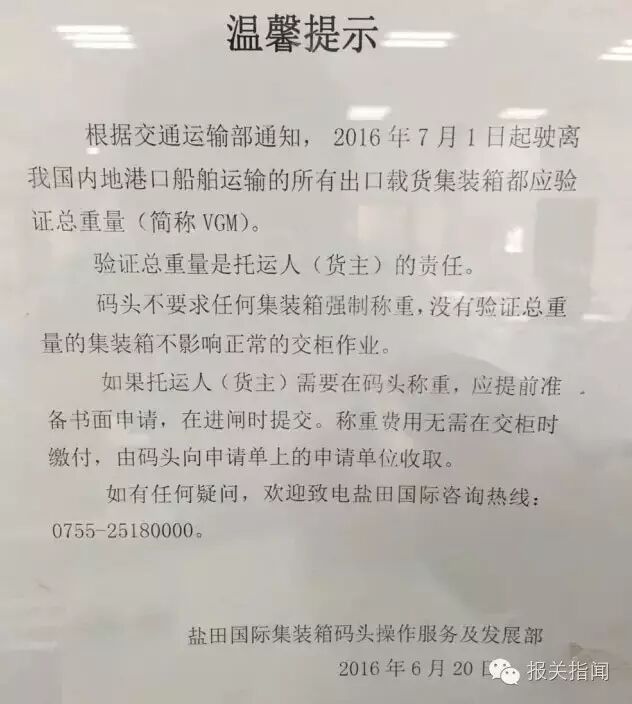 1、 拟交付计划于2016年7月1日零点以后驶离我国内地港口的船舶运输的外贸载货集装箱的托运人,应当在交付船舶运输前提供载货集装箱经验证的重量(以下简称“VGM”);