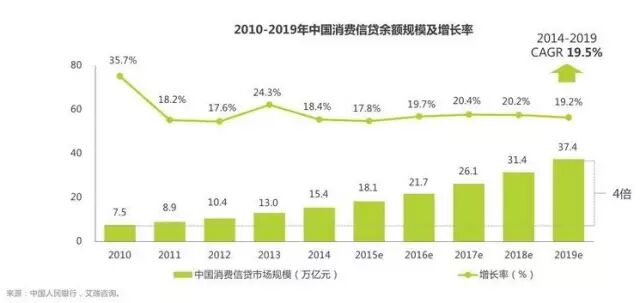 近年来,伴随着我国经济转型对刺激消费、扩大内需进而调整经济发展结构的迫切需求,以及居民收入和消费能力的提升,我国消费金融市场取得了快速的发展。数据显示,2014年中国消费信贷规模达到15.4万亿,同比增长18.4%,依然处于快速发展阶段。预计2014-2019年中国消费信贷规模依然将维持19.5%的复合增长率,预计2019年将达到37.4万亿,是2010年的5倍。
