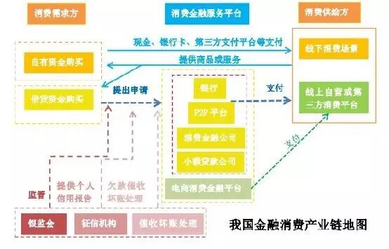 完整的消费金融产业链如下图所示,包括上游的消费需求方,核心的消费金融圈(消费金融服务平台和监管机构)以及下游的消费供给方。