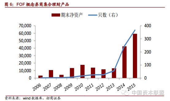 券商集合理财计划是国内 FOF 基金重要的实现形式。券商是我国私募基金 FOF 最早的发起者,如招商证券、光大证券、华泰证券等都是起步较早的 FOF 管理人。券商资产管理部门以集合理财的形式发起的 FOF 基金已经拥有相当的规模。近两年,无论是从资产规模还是发行数量来看,都有巨大的增幅,2014 年末净资产涨幅达到 224%,2015 年涨幅也接近 40%。然而这也只占到全部券商集合理财产品净资产规模的 1%左右,未来发展前景巨大。