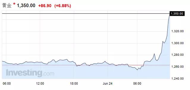 黄金大涨近7%,至每盎司1350美元,触及2014年8月来最高水平。