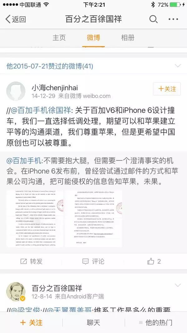 近日,深圳市佰利营销服务有限公司(深圳佰利)指控苹果的iPhone 6和iPhone 6 Plus侵犯了自己的外观设计专利,这一主张得到了北京市知识产权局的支持。北京市知识产权局责令苹果公司停止上述两款产品在北京区域内销售。当然,苹果公司并不认同这一裁定,眼下该公司已将北京市知识产权局诉至北京知识产权法院,法院也已立案。虽说最终结局依然未定,但能在北京市知识产权局的裁定中占得先机的深圳佰利,依然获得了舆论的聚焦。它的背后站着的,是担任过华为终端公司全球营销总监,宇龙酷派公司副总裁兼首任手机事业部总经理,后来创立了百加手机的徐国祥。深圳市百分之百数码科技有限公司董事长徐国祥。先来说深圳佰利。这家公司本身名不见经传。工商资料显示,深圳佰利成立于2012年6月,认缴注册资本为2000万元,系深圳市百分之百数码科技有限公司的全资子公司,法人代表是徐国祥。公司的经营范围涵盖数码通讯产品、电子产品的技术开发;手机的技术开发与销售;以及手机的生产(由分支机构经营)等。按照北京市知识产权局官网的资料,深圳佰利拥有专利号为ZL201430009113.9、名称为“手机(100C)”的外观设计专利,这正是该公司号称遭iPhone6和iPhone6 Plus两款手机山寨的一款外观设计专利。而深圳市市场监督管理局查询平台的信息显示,由于母公司百分之百数码科技的100%股权,眼下正遭遇法院冻结,深圳佰利的资产目前也遭到冻结,且限制时间已经排到2019年4月。“佰利公司已经没有开展业务,可能就指望着与苹果的这场知识产权官司了吧。”一名通信行业人士如是告诉澎湃新闻。相比之下,深圳佰利的母公司百分之百数码科技,在业界则有一定知名度。工商资料显示,百分之百数码科技成立于2006年10月13日,法人代表同样是徐国祥。这家公司的经营范围涵盖数码通讯产品、电子产品的技术开发;信息服务业务等。百分之百数码科技是有作品的。该公司之前出品的手机标识就是“100+”,又称百加手机。2013年互联网手机起势之时,这家公司曾推出过后壳可定制的手机。彼时,百加手机接受百度公司的投资,与百度共同运作百度云OS手机,百加手机也采用了百度的云OS系统。翻查工商资料,从股东名单中,依然可以看到这家公司当时的风光。除了徐国祥持有公司42.6213%股份外,北京百度网讯科技有限公司持有该公司22.5%股份,深圳市埃瑞斯投资发展有限公司持有该公司18.4043%股份。此外,浙江浙商长海创业投资合伙企业(有限合伙)、深圳市创新投资集团有限公司、深圳市福田创新资本创业投资有限公司等也都参与了该公司的投资。在2014年中国互联网大会期间,徐国祥在接受网络媒体采访时还曾放话,对公司的产品非常自信,“和任何品牌比我们有很强信心,唯一是我们知名度不够。”谈及商业模式,他表示,百加可以成为新的代表,即完全放弃硬件的利润,专心致志聚焦软件和服务。不过,在推出三款手机100A、100B、100C(就是100V6,和爱奇艺定制的视频手机,搭载百度云OS)后,百分之百数码科技就没了声响。不止于此。百分之百数码科技的资产还遭遇了大范围冻结。深圳市市场监督管理局网站显示,包括徐国祥直接持有的42.6213%股权,深圳市埃瑞斯投资发展有限公司持有的15.9%股权,均遭到法院冻结。同样可在网络查询到的,还有针对徐国祥的追索劳动报酬诉讼。但短短两年之后,所谓互联网手机风潮褪去,百加手机成了裸泳者。一名资深通讯行业人士对澎湃新闻表示,佰利公司和百分之百公司都是徐国祥的,这两家公司因为资金链断裂停止运营了,徐国祥早已不对外露面。徐国祥在微博上的认证,仍然是百分之百公司董事长,其微博自2012年8月14日后就没有更新。但在2015年7月21日,其微博点赞了网友转发的“百加手机徐国祥”的一条微博。这条微博的内容,涉及的正是和iPhone6的设计专利纠纷。“百加手机徐国祥”在这条转发“百加手机”的微博中称,“关于百加V6和iPhone6设计撞车,我们一直选择低调处理,期望可以和苹果建立平等的沟通渠道,我们尊重苹果,但是更希望中国原创也可以被尊重。”1995年,徐加入华为公司;1998年,负责组建华为数据通讯产品部,担任总监兼总工程师。2002年,加入宇龙酷派公司,任副总裁兼首任手机事业部总经理。2004年重返华为公司,任华为终端公司全球营销总监。2006年10月,创建深圳市百分之百数码科技有限公司。在公开报道中,徐国祥的前一次密集亮相,还是去年3月,百度云OS宣告停止更新时。当时他接受过媒体采访,还说这是缘于百分之百正在进行的新一轮融资正处于比较关键的时期,因此希望控制对云OS业务的投入节奏。再然后,就是百加手机业务停摆,公司及徐国祥个人陷入系列纠纷之中。“哎,徐国祥现在谁的电话也不会接。在这批互联网手机中算(过得)不好的。”一名业内人士感慨。(来源:澎湃新闻 作者:周玲)